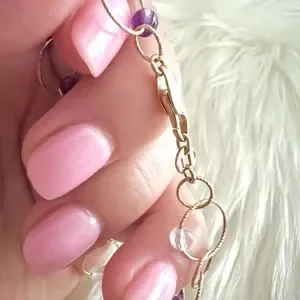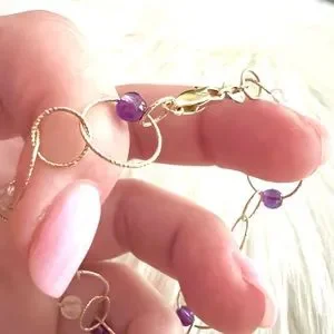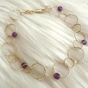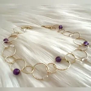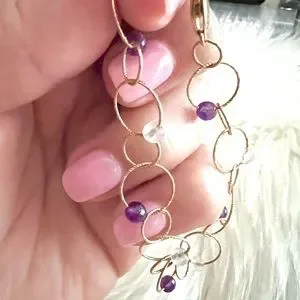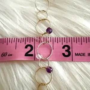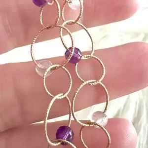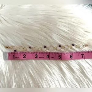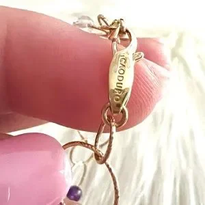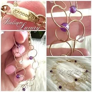 This is a stunning Italian luxury bracelet from high end designer CAODURO in Italy. Pure 14k yellow gold textured rings linked together with intermittent beads/stones of purple and transparent material. I imagine it’s quartz and or crystal and amethyst but I can not verify the beads/stones make up or composition. This bracelet is spectacularly dainty, and new. No bends or scratches or dings. Approximately 7.5 or 7 1/2 inches long… see pictures.