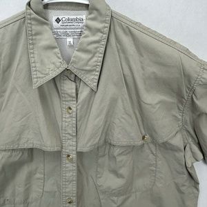 PS 14 Columbia Vented Tan/Gray Short Sleeve Button Shirt Damage on Front Pocket