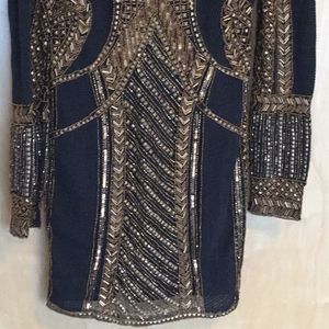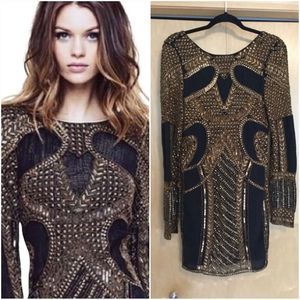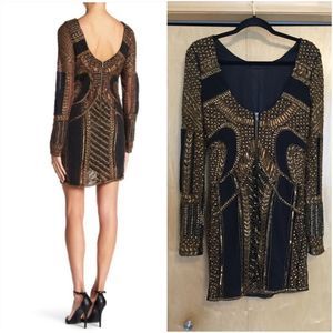 Ornate beaded & studded embellishment dot the surface of a sleek mesh bodycon dress that will catch the light as you dance the night away