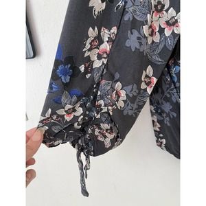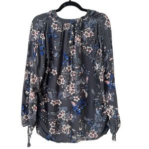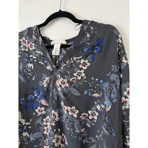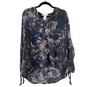 H&M L.O.G.G Blue Floral Long Sleeve Popover High Low Blouse. Lightweight and breathable with small keyhole cutouts and ties on the sleeves. This top has a V neckline, with a gray/blue color scheme.