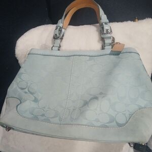 super cute light blue coach bag it's nicer in person , has suede material on the bottom just needs a little cleaning like new condition interior is clean