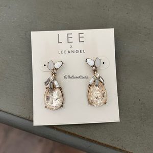 Beautiful stone drop earrings. Light pink stone with gold plating. A Lee by Lee Angel earrings pears polished resin carbochons and shimmering rhinestones. Post back. Gold plated.