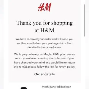 Brand New with Tags, MUGLER X H&M Women’s Mesh-paneled bodysuit in Dark/Brown, Size XL. The size was too large (but all I could get on drop) and It just didn’t fit my body type unfortunately for me.