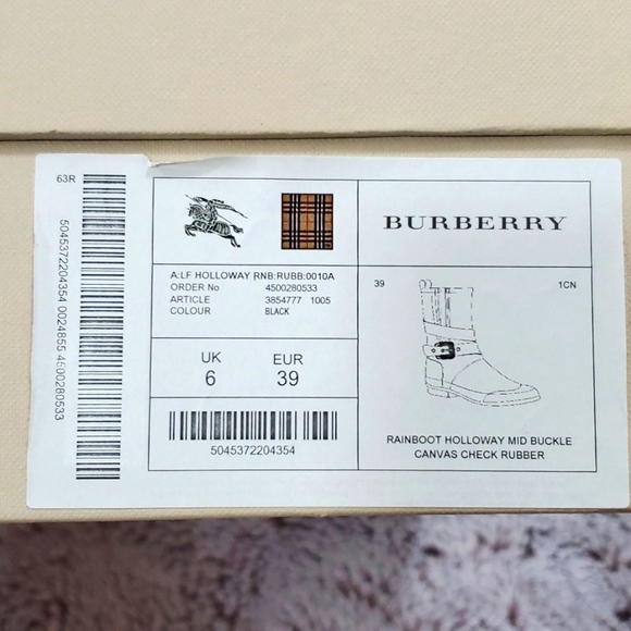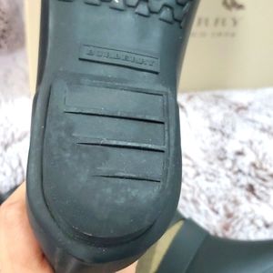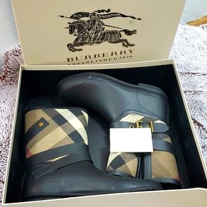 Absolutely stunning pair of Burberry Rain boots. Made of quality rubber and classic Burberry canvas. Very comfortable to wear and side gussets make it very easy to slide feet in and out. Rain boots that don't look like rain boots - very classy. Black colour accented with signature Novacheck details. They feature a belted design with gold-tone pin buckles. The insoles are fabric lined.