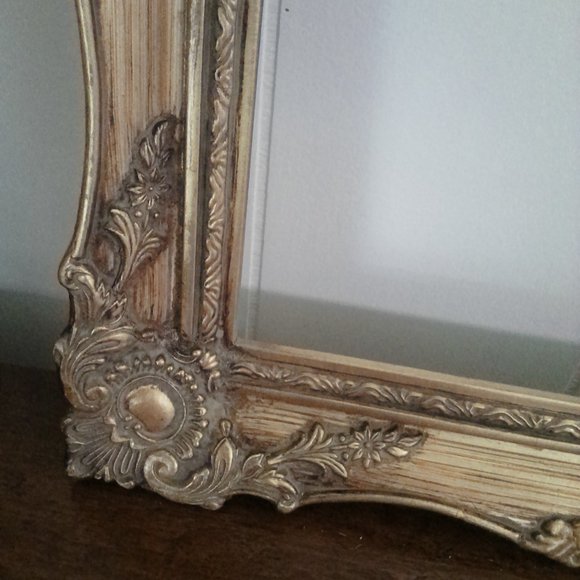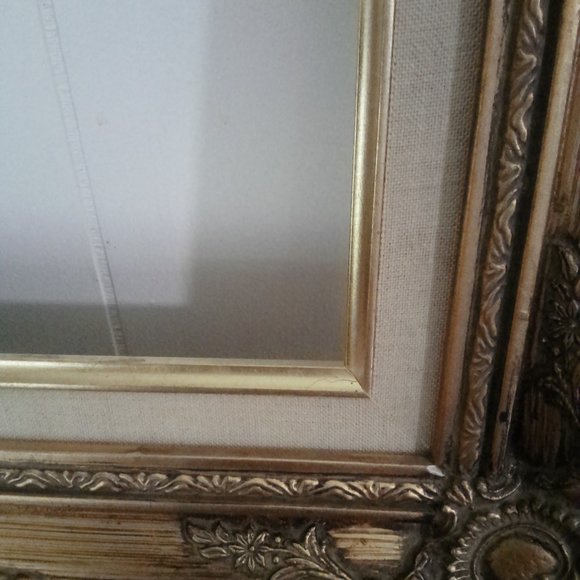 LAST MARK DOWN !!!!!!!!!!BEAUTIFUL GOLD FRAME WITH A WOOD INSERT COVERED IN LINEN.IWITH GOLD LINING INSIDE OF IT HAS TURNED A LITTLE YELLOW.I TRIED TO CLEAN IT THE BEST I COULD.I DIDN'T WANT TO MESS IT UP SO I LEFT IT UP TO THE BUYER.YOU WILL HAVE TO ATTACH THE INSERT.IM NOT SURE OF THE AGE.I RESEARCHED IT AND FOUND ALOT CLOSE TO THIS ONE.IM NOT SURE OF THE NAME.IT IS HAND CRAVED HAS BEAUTIFUL DETAIL.YOU CAN MAKE A 5X7 WITH THE INSERT OR WITHOUT THE INSERT THE WHOLE FRAME IS 13 3/4 X 15" 3/4" VERY UNIQUE FRAME.
