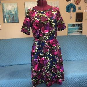 Jessica Howard floral dress. Lined. Print is very pretty with blue, green, magenta, and purple blurred flowers on scuba-like fabric so it has structure, a little on the thicker side. Nice quality dress. Has two little loops on each side if you wanted to wear with a skinny belt.