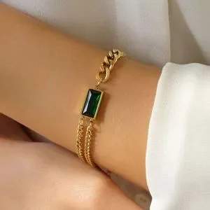 Green Zirconia Curb Mix Chain Bracelet | Gold Plated Stainless Steel