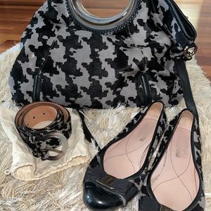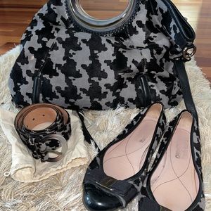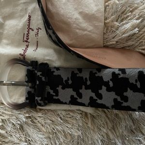 Houndstooth pony hair black and grey belt.