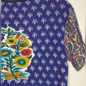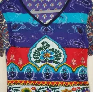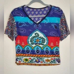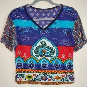 Crop Tee with short sleeves and V-neck. So colorful with many patterns and fun beadwork (front only). Boutique item!