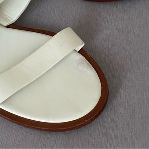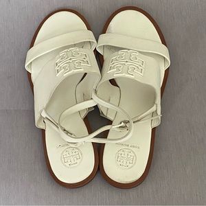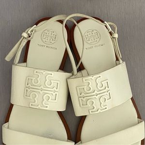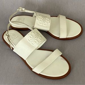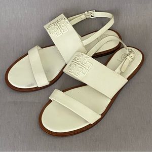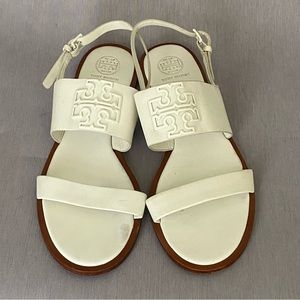 Tory Burch Flat White Slingback Sandals 8 M Big Logo Open Toe Leather