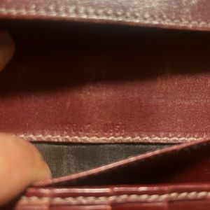 Gucci wallet. This is a continental wallet. This a burgundy womens wallet. The hardware is gold tone. Does show wear however still great.
