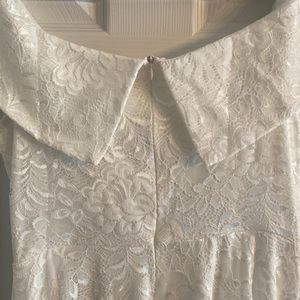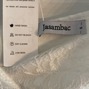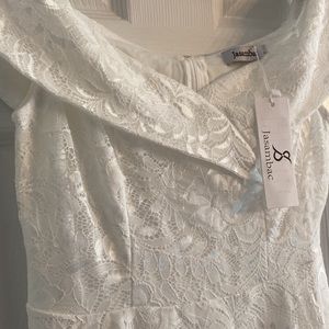 Jasambac white lace off the shoulder dress asymmetrical hem Zips up the back. Elegant and beautiful design. Great for bride to wear to her bridal shower or rehearsal dinner. Special occasions dress, holiday party, dinner dates, cocktail parties! New with tags