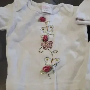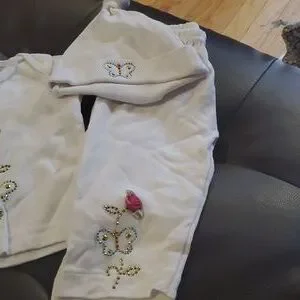 white with beaded butterflies with pink roses apliques shirt, pant & hat