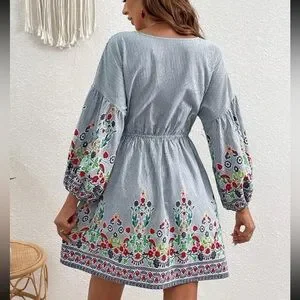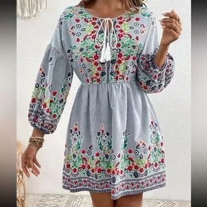 Boho Floral Print Tassel Stripes Long Sleeve Dress