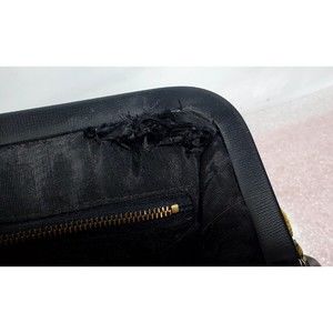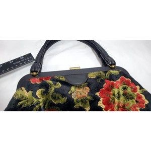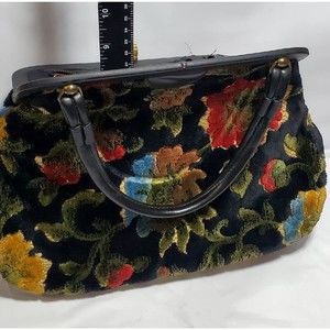 Tapestry Purse Unmarked Floral Design. Has a wooden like exterior framed opening with a velvet feel exterior with a unique brass closure the only marking is on the zipper which says Falcon. Has been repaired.