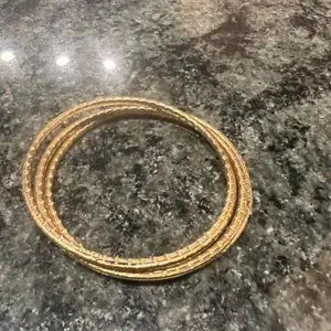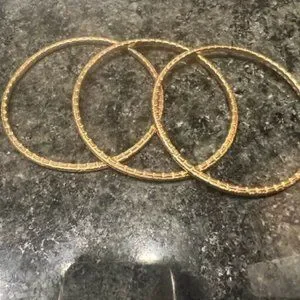 Set of 3 Gold-Filled Stackable Bangle Bracelets. 2 1/2 inches in diameter. Heavyweight and sturdy. Intricately designed. I think these are J. Crew but I can't locate the stamp. only worn once. Perfect condition.