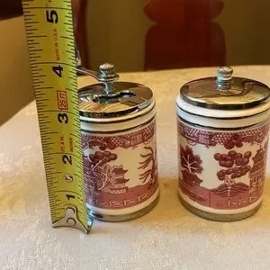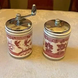 Flintridge Olde Thompson Red Mill salt mill and pepper mill set, rare! Beautiful vintage pieces made in Monterey Park, CA. The salt shaker needs a small metal repair to its lid, as pictured. Lovely maroon imagery.