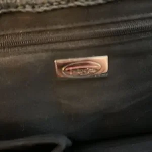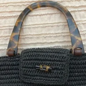 Black straw, clean and barely used. Plastic tortoiseshell handles and button. 14” wide 8”tall
