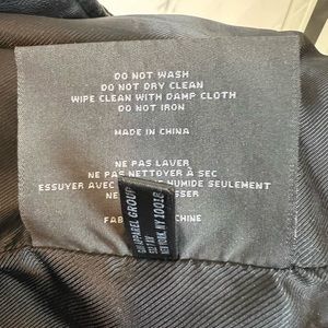 Off center front zipper and 2 zippered front pockets. Front can be zipped to neck and snapped down with collar buttons. Additional small coin pocket in front.