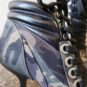 Gianni Bini Jarret lace-up design booties. Asymmetrical heel. Camo print suede upper mixed with leather and nylon. Synthetic lining and outsole.