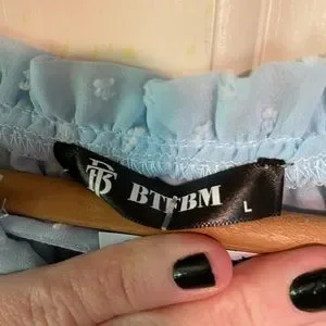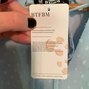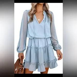 NWT BTFBM Women Casual light blue Dress V Neck Tie Neck Long Sleeve Dot Ruffle
