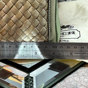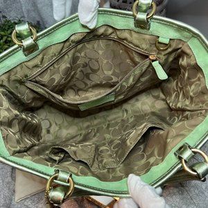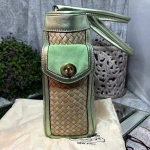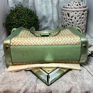 Coach Straw Bag with Light Green Metallic Leather and Suede Trim with Two Side Pockets, Flap Buckle Closure, and Original Dust Bag