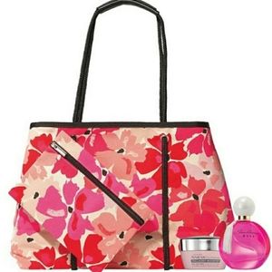 Avon Beauty Bundle includes sturdy poppy-print canvas tote with matching cosmetic pouch, Far Away Bali Eau de Parfum and Isa Knox Anew Collagen Booster Eye Lift Pro Gel. A must-have collection!