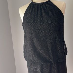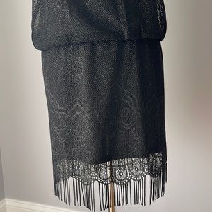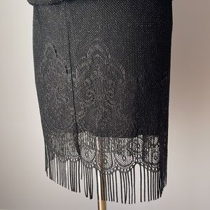 SLNY Black Blouson Halter Crochet Fringe Hem Short Dress Size 8