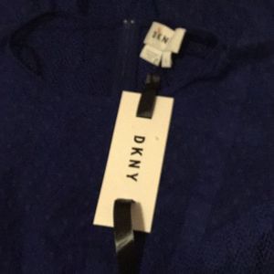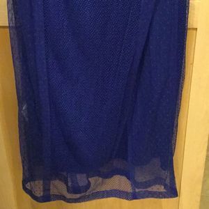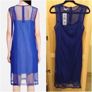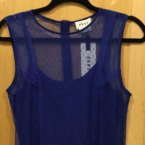 Blue cotton blend sleeveless tulle dress from DKNY featuring a round neck, sheer panels, a back zip fastening, a mid-length and a straight hem.