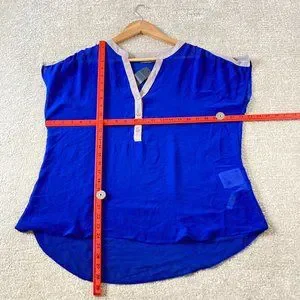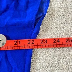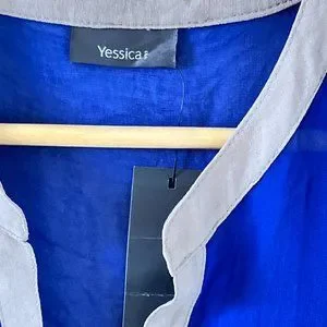 Make a statement in this beautiful Yessica BNWT UK size 18 cobalt blue sheer blouse. With a delicate sheer fabric, this blouse is perfect for any occasion. The cobalt blue shade is sophisticated and timeless, while the design features a flattering V-neckline and a button-down front. The long sleeves and slightly flared silhouette create a romantic look. The blouse is lightweight and comfortable, making it ideal for warmer days. The classic design ensures that you will be able to wear this top for years to come. With its timeless design and color, you can style this versatile blouse with a variety of different looks. Whether you pair it with jeans or dress it up with a skirt and heels, you are sure to look stunning in this Yessica blouse. Add this must-have piece to your wardrobe today!