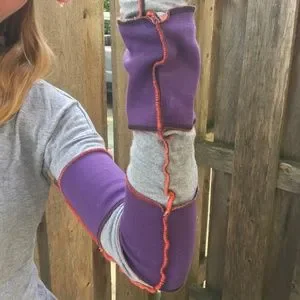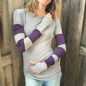 Incredibly soft! Gray long sleeve shirt with purple and gray striped sleeves and orange exposed zombie stitching. Thumb holes at the end of the sleeves. The sleeves on this shirt fit a little more snuggly than some of my other shirts. Please check measurements. Made from designer recycled materials.