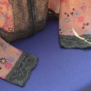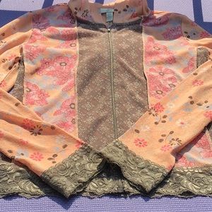 Gently worn, clean inside and outside, lined dry, sheer jacket with mixed flowers for design,long sleeve, hoodie, beautiful lace borders,very good condition, sexy feel, size xs