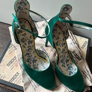 Emerald color, size 38 (US 8), light wear on sole of shoe, authentication included, worn once to wedding.