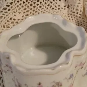 🥀estate sale find ~shabby chic style sugar bowl with two handles and lid~ no cracks chips or defects but gold edging does show wear due to age unknown ~beautiful roses, sprigs and branches🥀