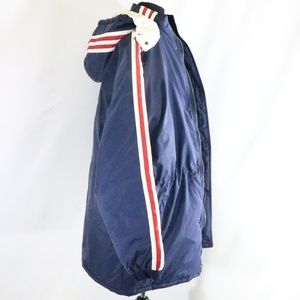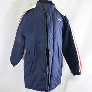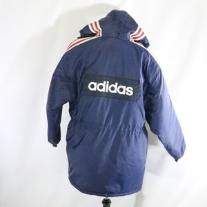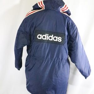 ALL NEW, WITH TAGS vintage Adidas Puffer Jacket. Snap buttons and full zip, quilted white satin lining, alternating red and blue shoulder and arm stripes, oversize ADIDAS logo on back and small left chest logo. No holes, tears or otherwise. All new, great outerwear piece! Smoke and pet free.