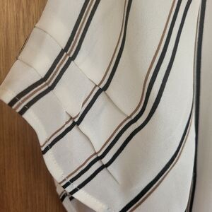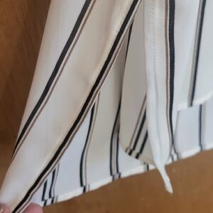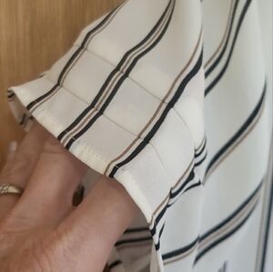 Daniel Rainn DR2 blouse, ivory with black/brown stripes, button key hole back, layered tiered sleeves, flowy and light with side slits, slight hi-lo