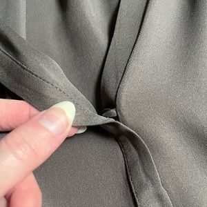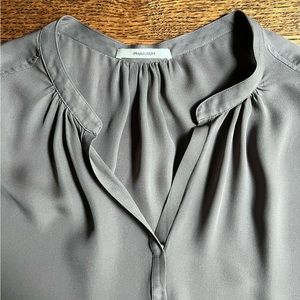 Stunning 100% silk batwing blouse from Pharaoh. Neutral, earth-tone shade of warm taupe gray. Gathered collarless neckline, notched v-neck with two hidden buttons that open the blouse lower if desired. Subtle batwing-style sleeves, loosely fitted and flowing without having a ton of extra fabric around the waist. 3/4 long sleeves. In excellent, gently worn condition with no visible flaws. There may be a few teeny tiny pricked threads that my eyes have missed, but there are no lines or runs in the fabric.