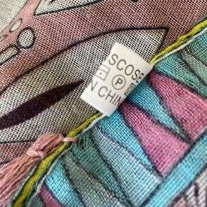 Gorgeous Color Combination on 37” Square Peacock Inspired Scarf or Sarong or Tablecloth. Tassels on Edges. Double Tassels on Corners. 100% Viscose.