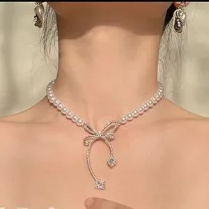 Gorgeous Elegant Rhinestone Pearl Bow Necklace Choker