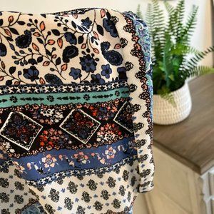 It carries that Bohemian vibe and is adorned with patterns of white, black, smoky blue, turquoise, and dusty rose.