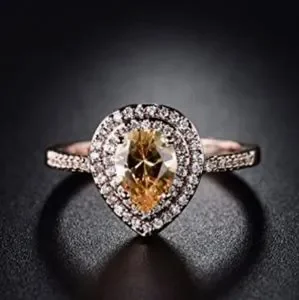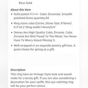 Vintage Citrine Rain Drop Diamond Baguette 18k Rose Gold Ring, vintage design, diamond cz Embellished around yellow Citrine Rain Drop shaped main stone, Simulated, excellent quality and condition no signs of wear use or damage mint, Electroplated Over silver