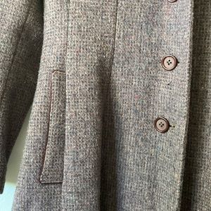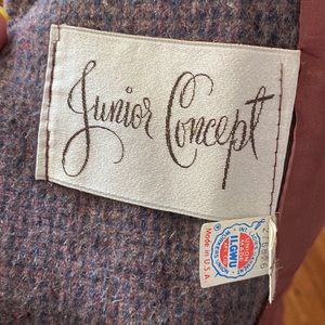 Feminine cut with gorgeous details. Three pockets no missing buttons lined with a maroon silk. Light purple & blue checkered pattern with dark maroon velvet collar. Made in USA.