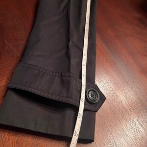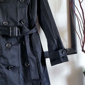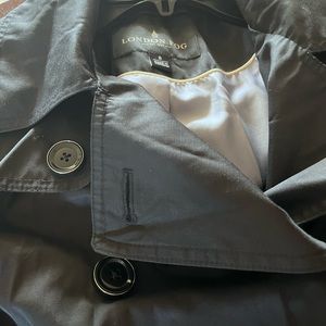 London Fog black trench coat. Double line of ten buttons, detachable waistband and hood. Lined, Excellent condition, carefully stored. Please, see pictures as part of description.