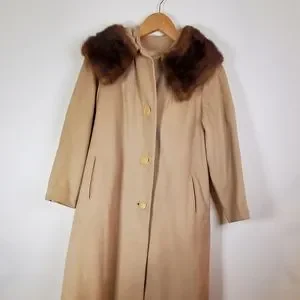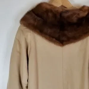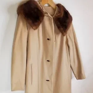 Beautiful, timeless elegant cream/ beige vintage coat with fur collar, from the 1950s or 1960s. Coat has large round buttons, pockets and a classic fit. Coat has real fur drop collar and lined interior.