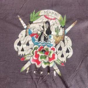 Nixon Mens sample sale T-shirt, purple gray color, distressed light bleached, exclusive design, surf skeleton mermaid logo, size medium
