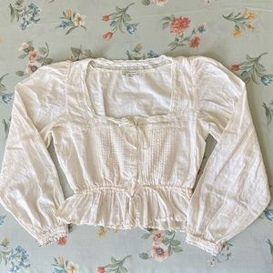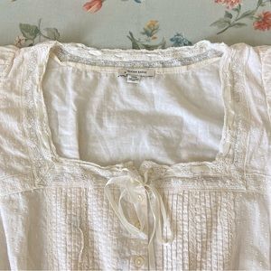 The most adorable coquette blouse! Brand is American Eagle, originally $65. Beautiful silk ribbons to tie bows in the center, and lace detailing around the square neckline. So flattering and cute with a pair of jeans or a longer skirt! Fits cropped. Disclaimer, there is a tiny spot as shown in the last photo, but it’s barely noticeable.