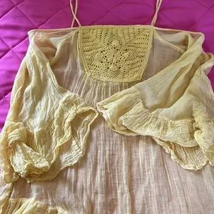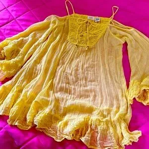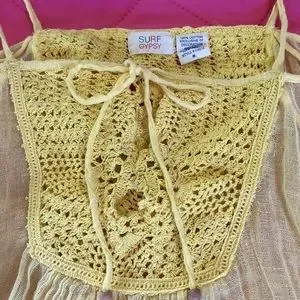 Surf Gypsy yellow gauze swimsuit coverup. Macrame around neck, size medium with off the shoulder straps and 100% cotton.