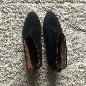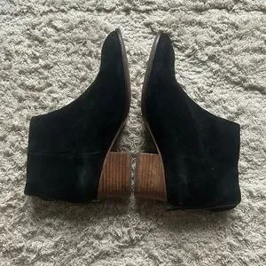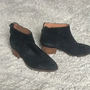 Seychelles black suede ankle bootie. Size 7.5. Had a little bit of wear and a faint mark on the left shoe (as shown above). But still wearable and in great condition!