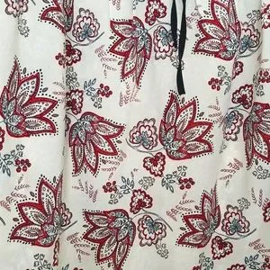Women's Sanctuary long-sleeve peasant top featuring a white and red bohemian/paisley print with black trim. Has a V-neckline with a tie closure and is made from lightweight, flowy polyester.