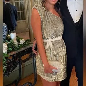 Wore this dress to a friends wedding I probably won’t wear it again, but I love it so much. I bought it in another color. It has a tie for the waist, and the one shoulder has a shoulder pad in it.